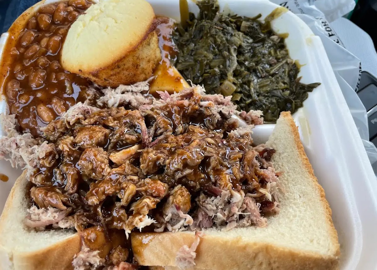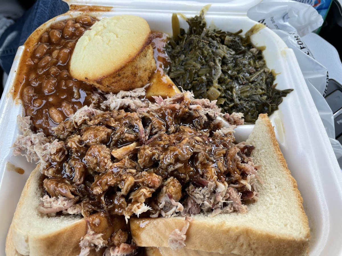 While flying in to work for one day, the gentleman I sat next to recommended this place. It was a few miles from the work location so I gave it a shot. Food tasted great, I loved the greens, old school cornbread (not that cake-like texture stuff some pass off as cornbread lol). I got a pork sandwich dinner. Chopped pork had a great flavor, portion was plentiful. My only issue is there was no dining in, to go orders only. I ate in their parking lot in my rental car, so I carried it from their counter to my car just a few feet out the door. A to-go box, even handled gently was a big mess when opened. Glad I didn’t take it any further down the road.